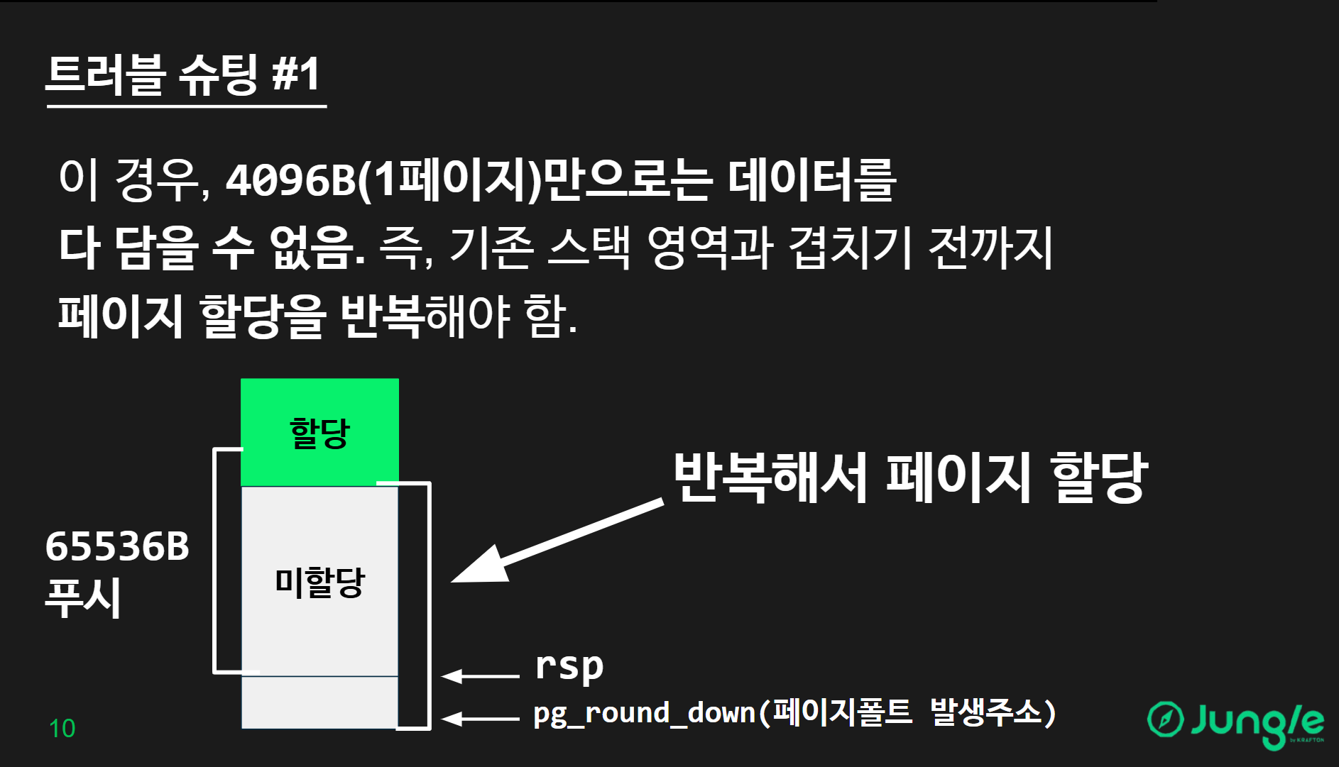 1페이지가 4096바이트니까 총 16페이지가 필요합니다. 그러니까 한 페이지만으론 턱없이 부족하겠죠. 결국 페이지폴트 발생 주소에서 시작해서, 기존 스택 영역과 부딪히기 전까지 페이지 할당을 반복해야 테스트 케이스를 통과할 수 있었습니다.
