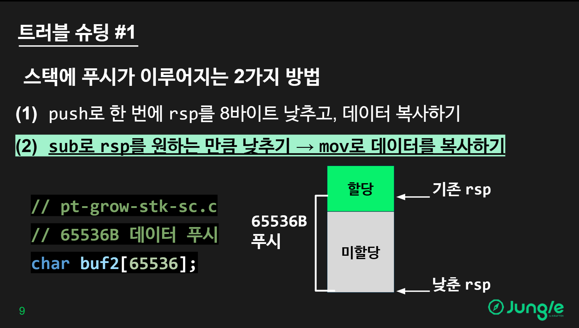 실제로 push 명령어로 rsp를 8바이트 낮추고, 데이터를 복사할 수 있습니다. 문제는 스택 푸시가 꼭 push 명령어로만 되지는 않는다는 점입니다. sub 명령어로 rsp를 원하는 만큼 낮춘 후, mov로 데이터를 복사하는 식으로도 푸시가 가능합니다. 실제로 65536바이트의 데이터가 스택에 잘 푸시되는지 체크하는 테스트 케이스가 있었죠.