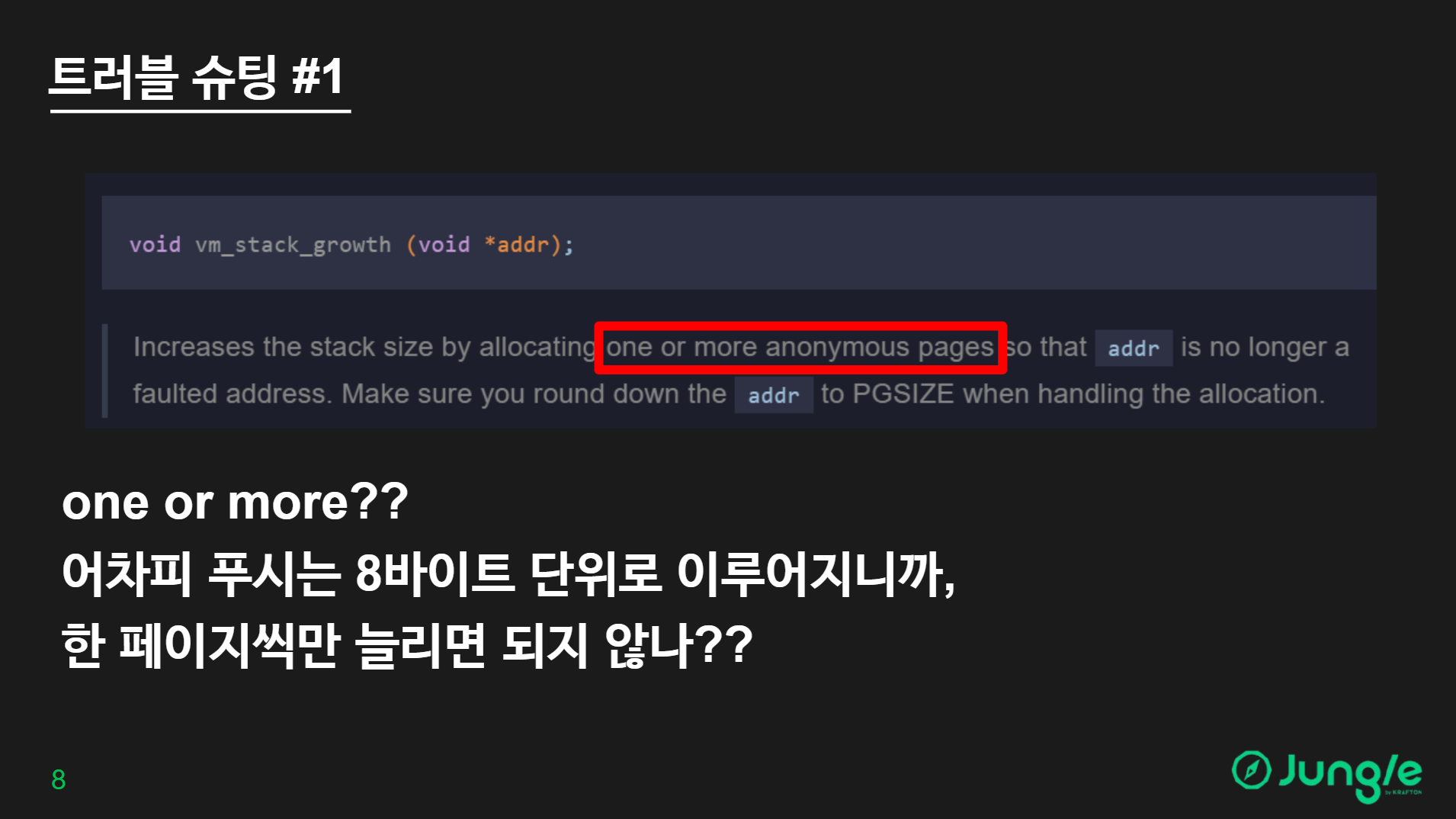 안녕하세요. 저는 vm_stack_growth 함수를 구현하면서 겪은 트러블슈팅을 공유해 보겠습니다. 아시다시피 스택 메모리가 부족할 때, 추가로 가상페이지를 추가로 할당하는 함수입니다. 그런데 깃북에선 one or more anonymous pages, 즉 1개 이상의 가상 페이지를 할당해야 한다는 언급이 있었습니다. 여기서 "1개 이상"인게 이해가 안 갔습니다. 분명 푸시는 8바이트 단위로 알고 있었어서, 한 페이지를 넘을 일이 없지 않나 싶었습니다.
