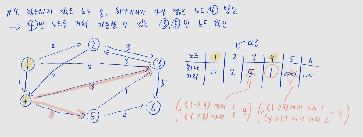 • (3) 방문하지 않은 노드 중, 최단 거리가 가장 짧은 노드 방문
