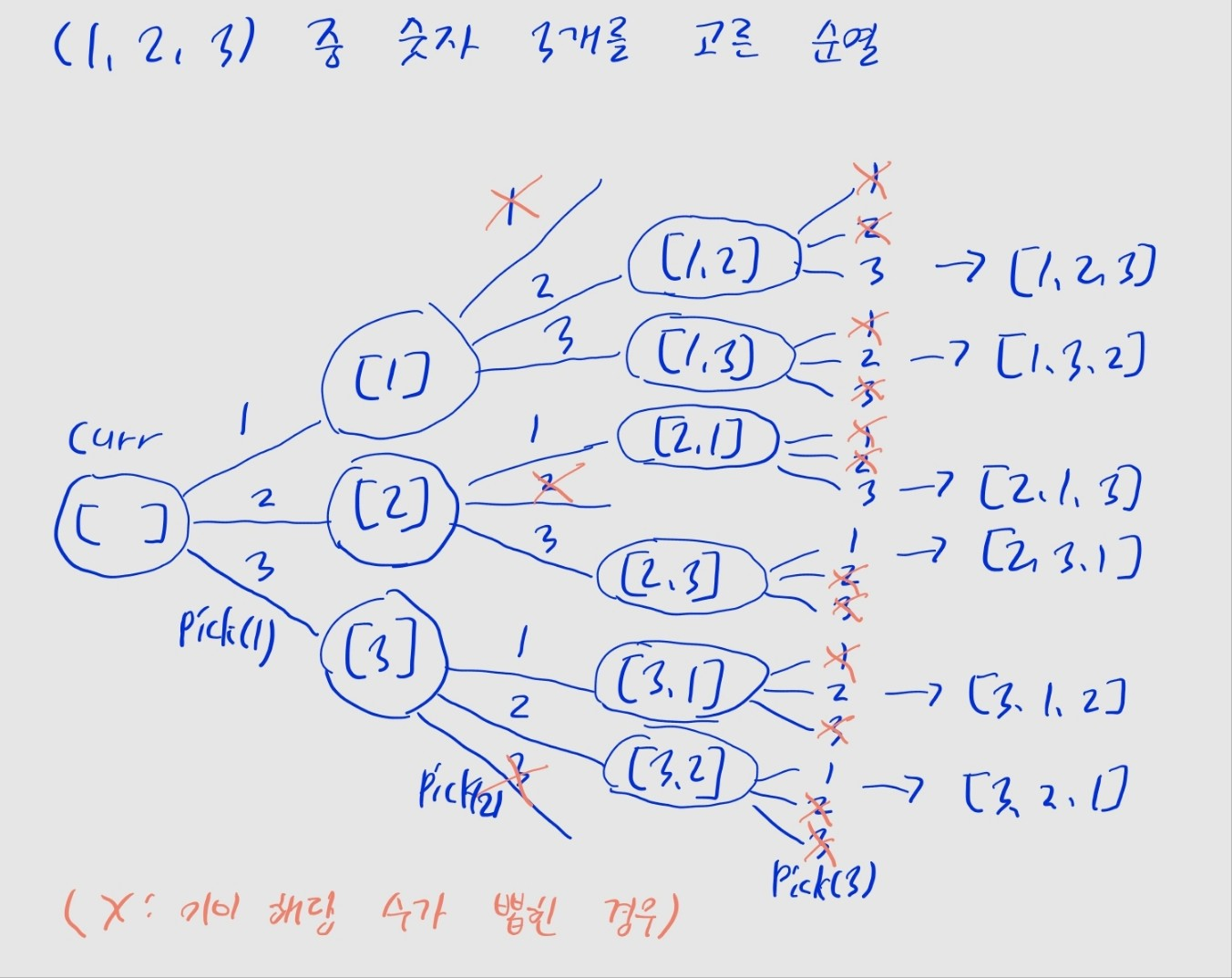 pick(i) 정의: 순열의 i번째 원소를 선택하는 함수pick(1)부터 호출pick() 내부에선 for문을 통해 부터 까지의 수 k를 하나씩 순열에 추가하려고 시도picked[k]가 참일 때)의 경우 선택 불가능k를 추가할 때, picked 배열의 해당 인덱스 값을 True로 바꿔 주고, curr 배열에 k를 추가pick(i + 1)을 호출하여, 다음 숫자를 선택하기curr.pop()으로 curr 배열에서 k를 빼고, picked 배열의 해당 인덱스 값을 False로 바꿔야 함curr을 출력