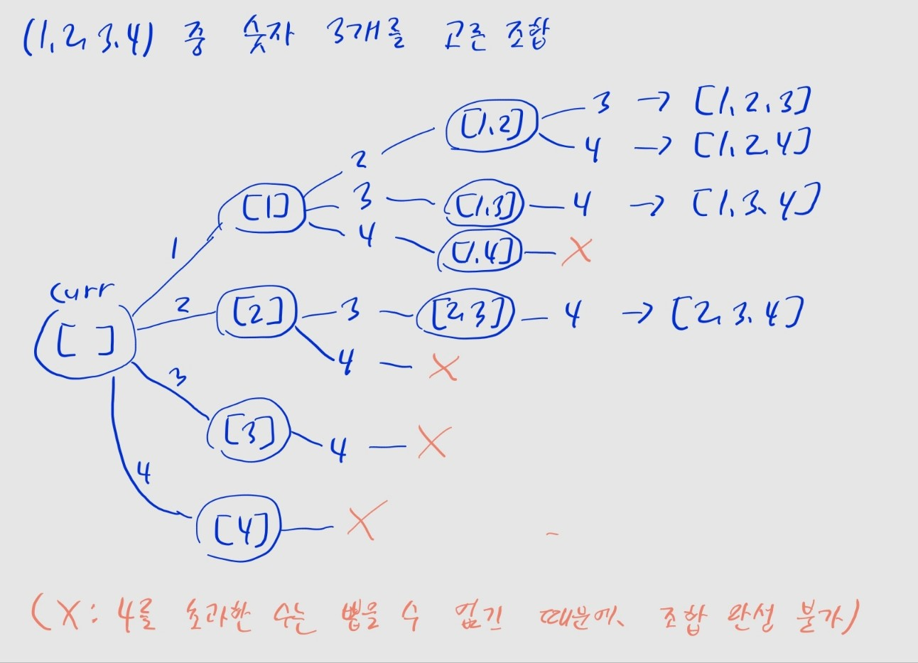 pick(i, begin) 정의: 조합 i번째 원소를 선택하는 함수begin 이상의 수만 고를 수 있음 (본 문제에선 조합 내 수를 오름차순으로 나열해야 함)pick(1, 1)부터 호출pick() 내부에선 for문을 통해 begin부터 까지의 수 k를 하나씩 조합에 추가하려고 시도k를 추가할 때, curr 배열에 k를 추가pick(i + 1, k + 1)을 호출하여, 다음 수를 선택하기k 미만의 수를 뽑을 수 없음k를 뽑을 수 없음 (이거 때문에 순열에 썼던 picked는 여기선 필요 없음)begin 매개변수는 k+1로 설정curr.pop()으로 curr 배열에서 k를 빼야 함curr을 출력