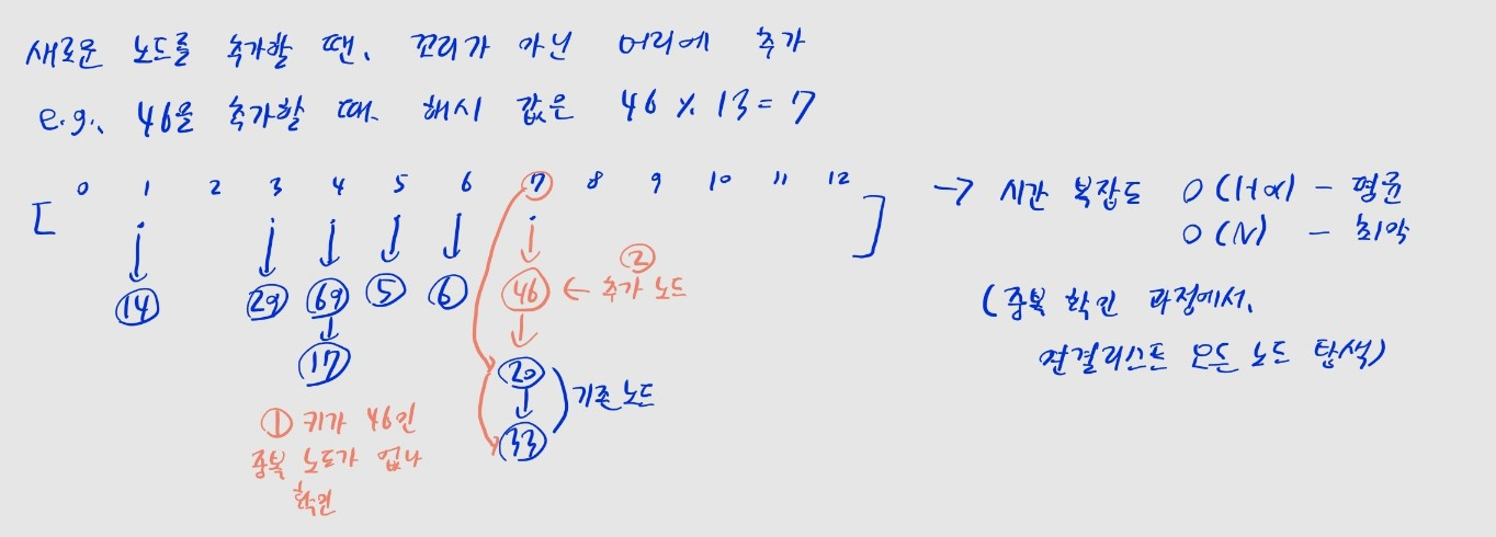- 체인법 (오픈 해시법): 해시코드가 같은 원소들을 연결 리스트에서 관리