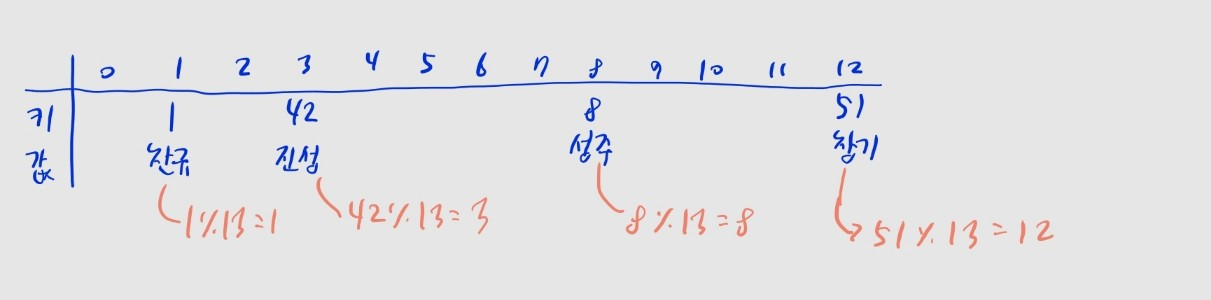 1, 값: 찬규)은 1번 인덱스에 저장됨. 1mod13=1