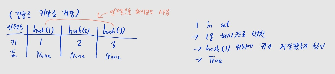 dict형은 키와 값이 함께 저장된 해시 테이블, set형은 키만 저장된 해시 테이블