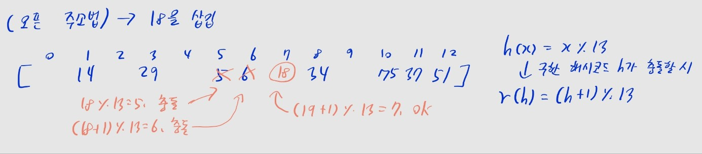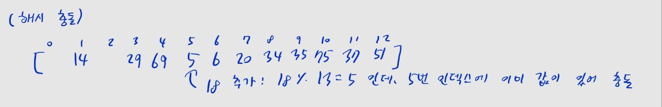 - 키 5가 5번 인덱스에 저장된 상황에서 키 13을 삽입하려고 할 때 충돌 발생