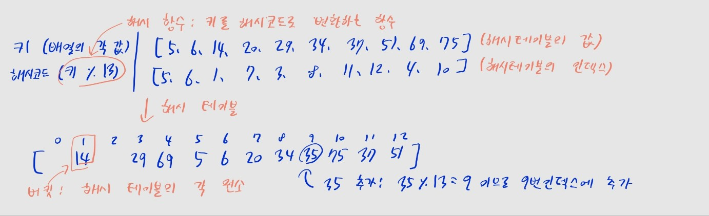 - e.g., 35 삽입: 35mod13=9 -> 해시 테이블의 9번째 원소에 35를 삽입하면 끝