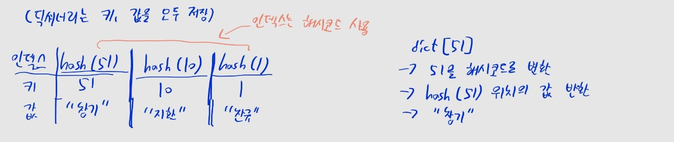 a = {51: "창기", 10: "지환", 1: "찬규"}일 때, 51, 10, 1이 해시 테이블의 키
