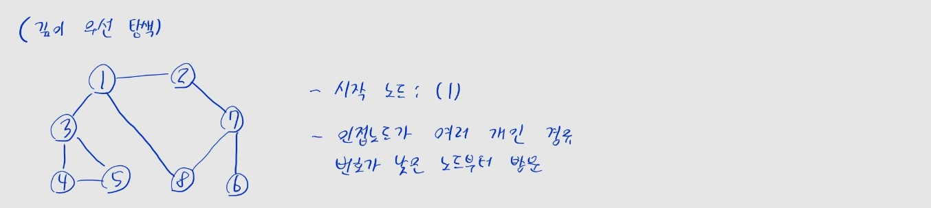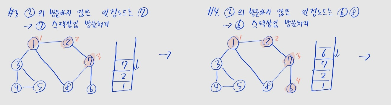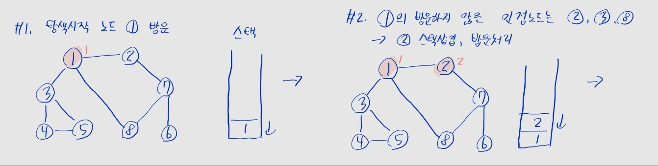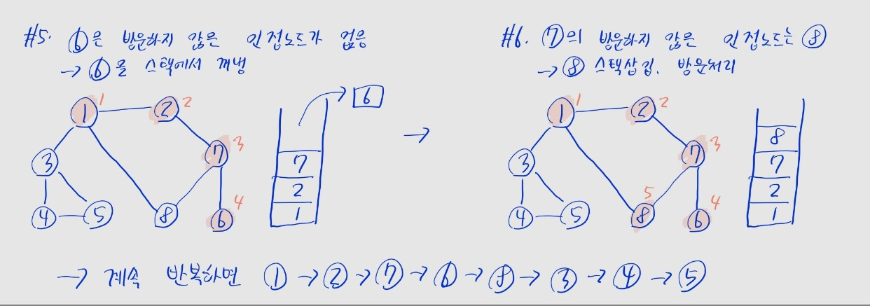 1번 노드부터 DFS 탐색을 시작1 -> 2 -> 7 -> 6 -> 8 -> 3 -> 4 -> 5