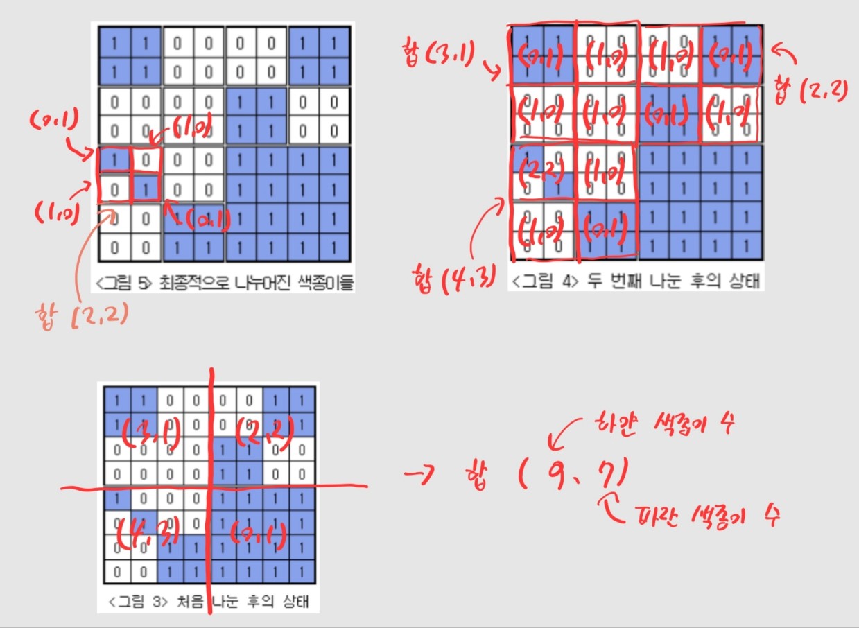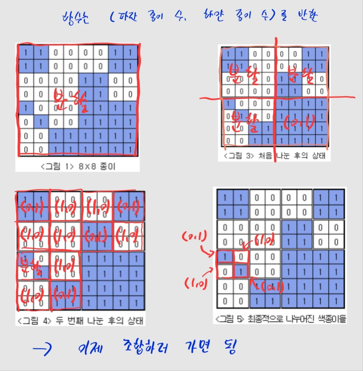 • 반환값: (하얀색 색종이 수, 파란색 색종이 수)