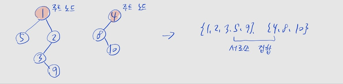 {1, 2, 3}과 {4, 5, 6}은 서로소 관계{1, 2}와 {2, 3, 4}는 서로소 관계가 아님 -> 공통 원소 2를 가짐