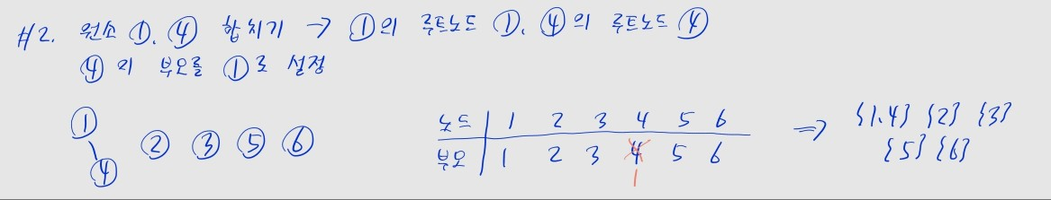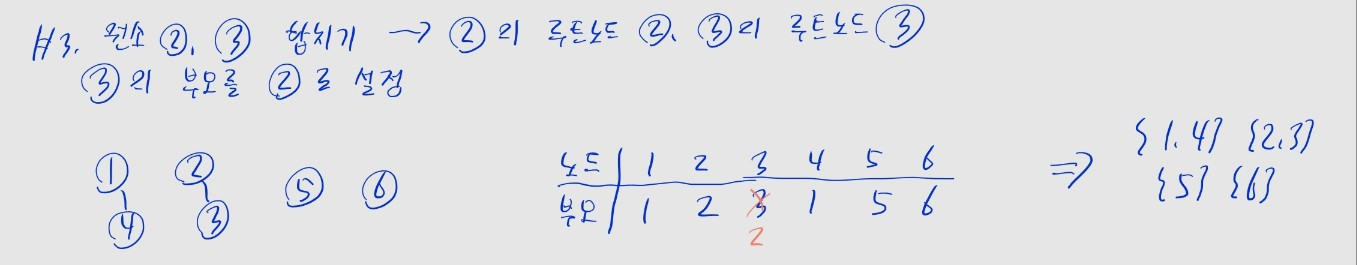 A와 B의 합집합 연산은, A가 속한 집합과 B가 속한 집합을 합침A의 루트 노드와, 노드 B의 루트 노드를 찾음