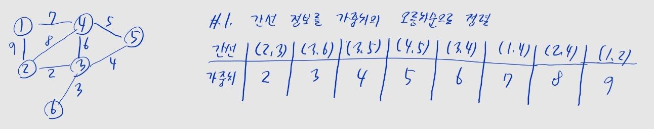 2 + 3 + 4 + 5 + 7 = 21find, union 함수는 앞선 코드와 동일(가중치, 노드 1, 노드 2)만 edges 리스트에 포함list.sort()는 기본적으로 튜플의 첫 원소를 기준으로 정렬하므로, 가중치를 맨 앞에 둠def find(parent, x):