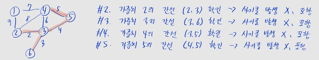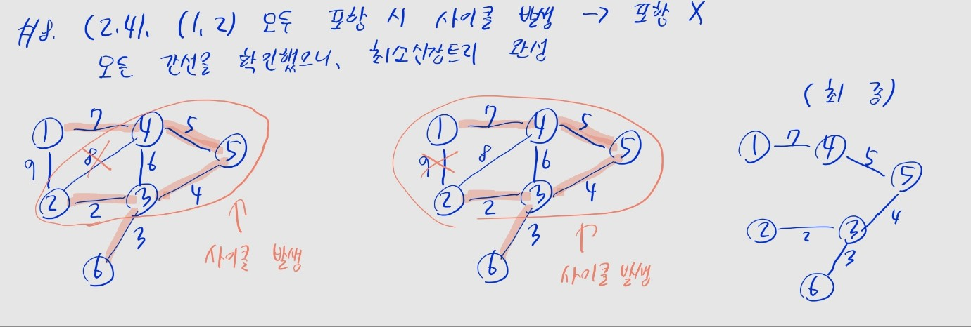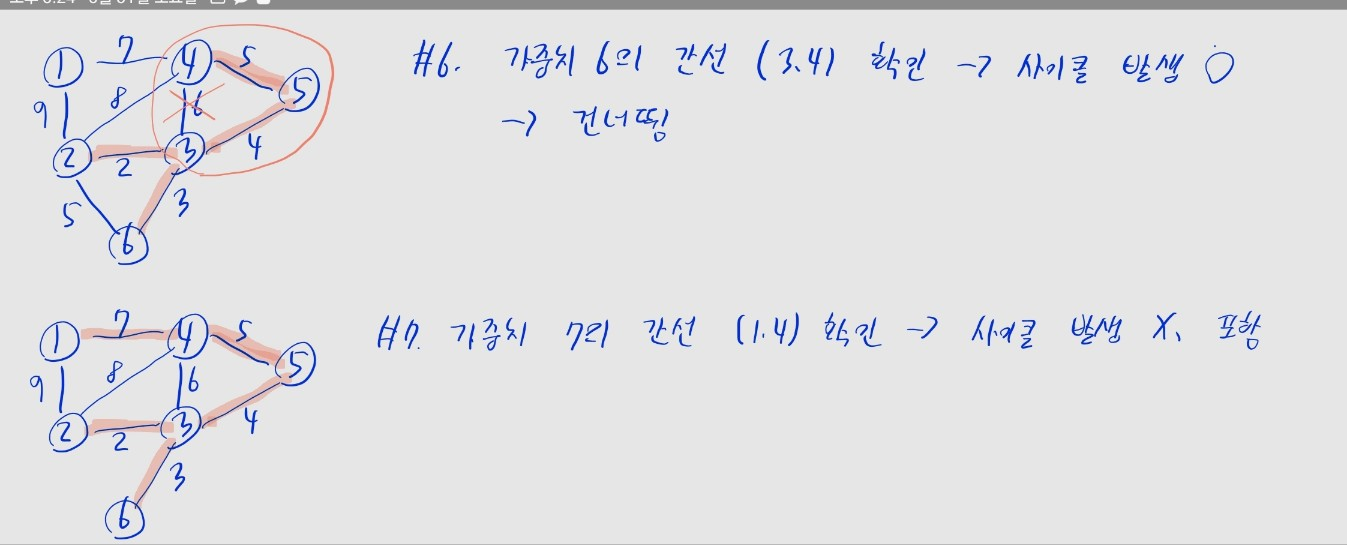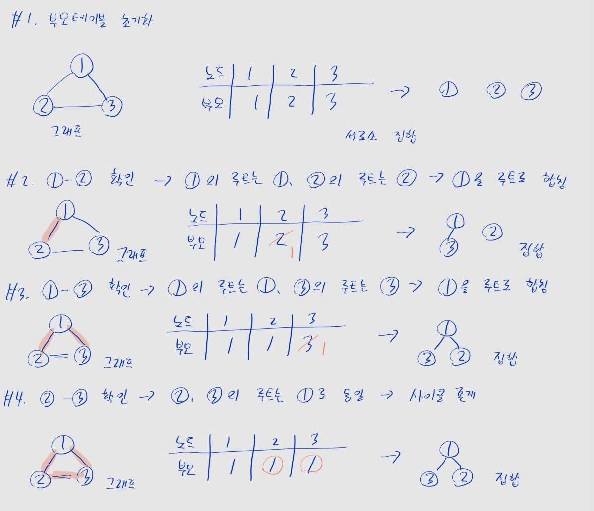 - 루트 노드가 같으면, 사이클이 발생한 것- 모든 간선에 대해 위 과정을 반복