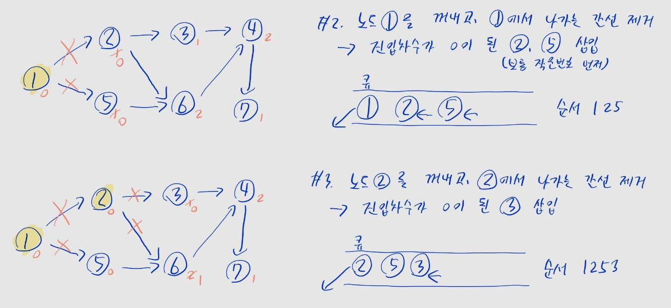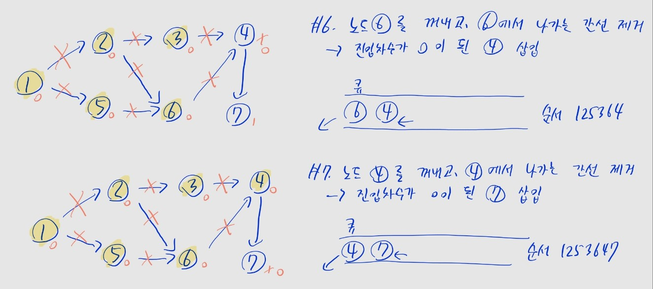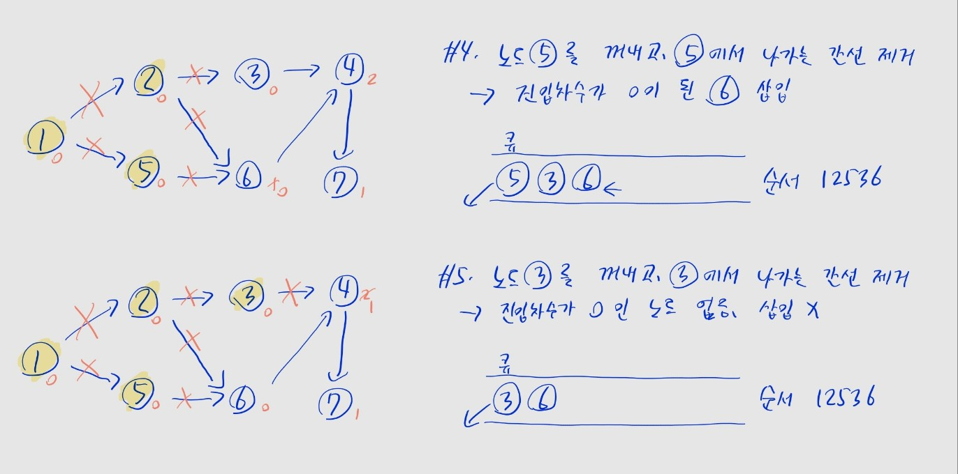 위상 정렬에서도 선행 조건을 지키며 작업의 순서를 결정하게 됩니다.