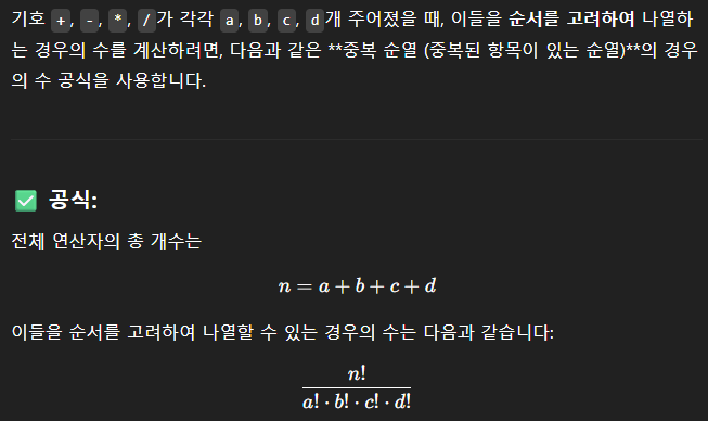 result에 숫자들이 담긴 값 arr의 i번째 값을 연산하는 calculate 함수를 정의합니다.result는 arr[0], i는 1로 둡니다.pl, mi, mu, di로 각각 남은 덧셈, 뺄셈, 곱셈, 나눗셈 연산자 수를 보냅니다.result 매개변수 자리에 연산 결과를 대입하는 식으로 구현합니다.-((-A) // B)와 같이 음수 값 A를 부호반전하고, B로 나눈 뒤 다시 부호반전하면 됩니다.분기 설정