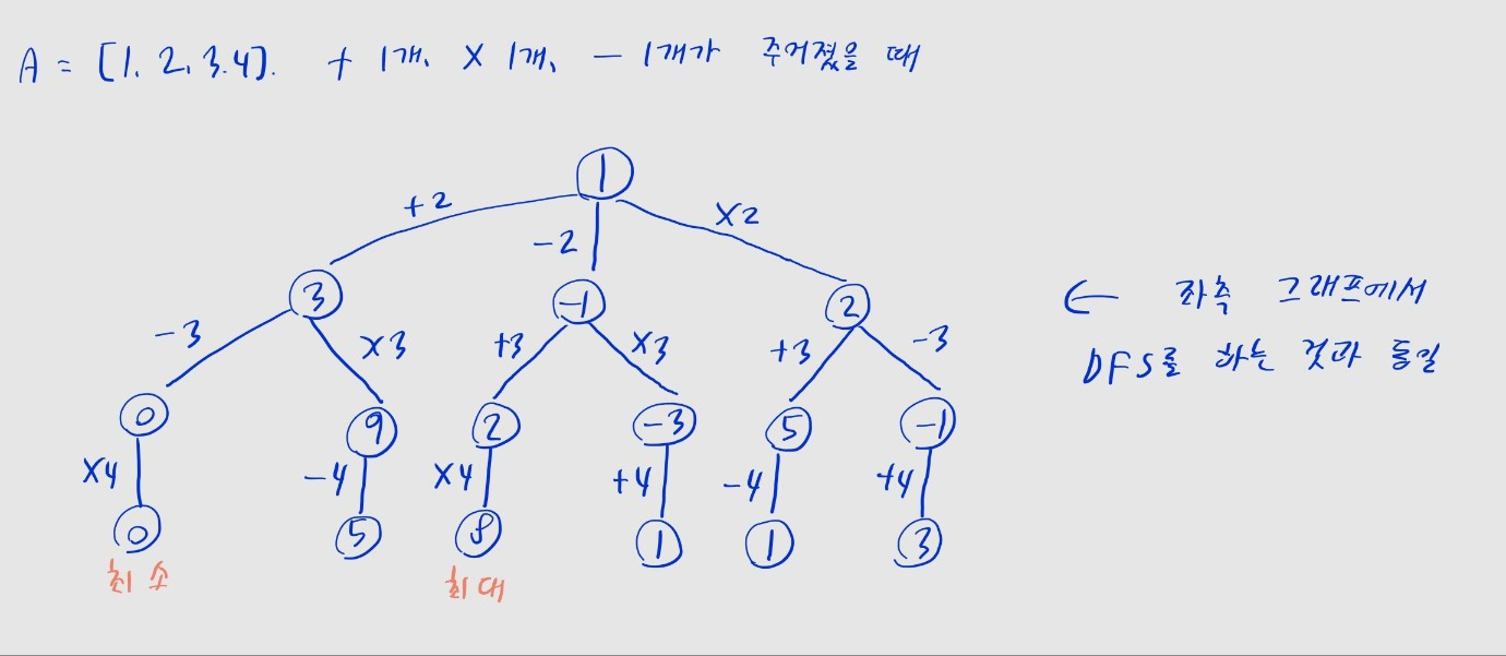 i == N (모든 숫자를 다 계산한 경우)이 되면 재귀 호출을 종료합니다.result 매개변수의 값을 global 설정을 해 둔 max_value, min_value와 비교하여 갱신합니다.