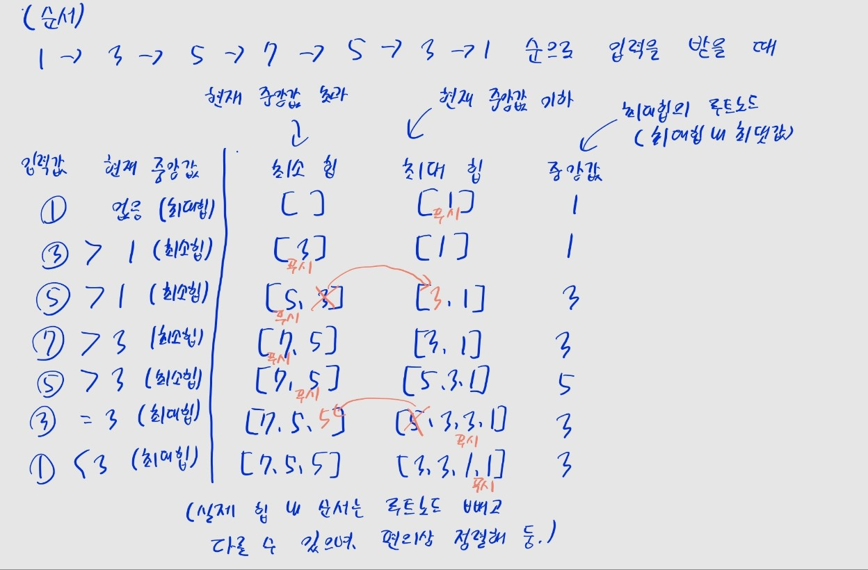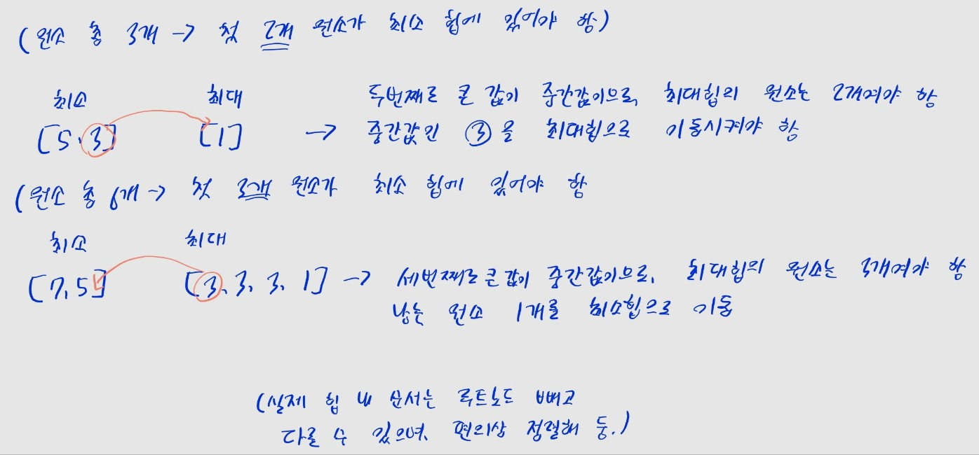 heapq.heappush(max_heap, -num) 식으로 푸시 값을 음수 처리하고, 팝할 땐 반환값을 -heapq.heappop(max_heap), -max_heap[0]으로 음수 처리해야한다는 점 기억합시다.heapq 모듈은 최소 힙 기반이므로, 이런 처리가 필요합니다.i일 때 i + 1개 숫자가 입력된 상태므로, 최대 힙에 ((i + 1) + 1) // 2 -> (i + 2) // 2개의 원소가 있어야 정상입니다.heappush heappop 모두 최대 힙, 최소 힙을 둘 다 활용하면 최솟값, 최댓값 아닌 수도 꺼내올 수 있다.