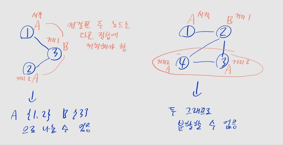 bfs 함수는 큐에서 팝한 노드 i와 인접한 노드 j를 확인할 때j가 미방문 노드인 경우i가 A면, 인접 노드 j는 B로i가 B면, 인접 노드 j는 A로 분류합니다.j가 이미 방문한 노드인데, i와 동일 집합으로 분류된 경우i, j가 동일 집합에 속하니False를 반환합니다.def check(graph):
