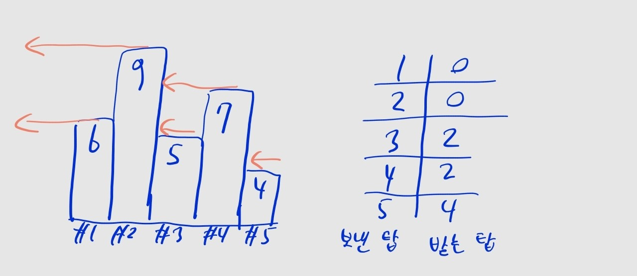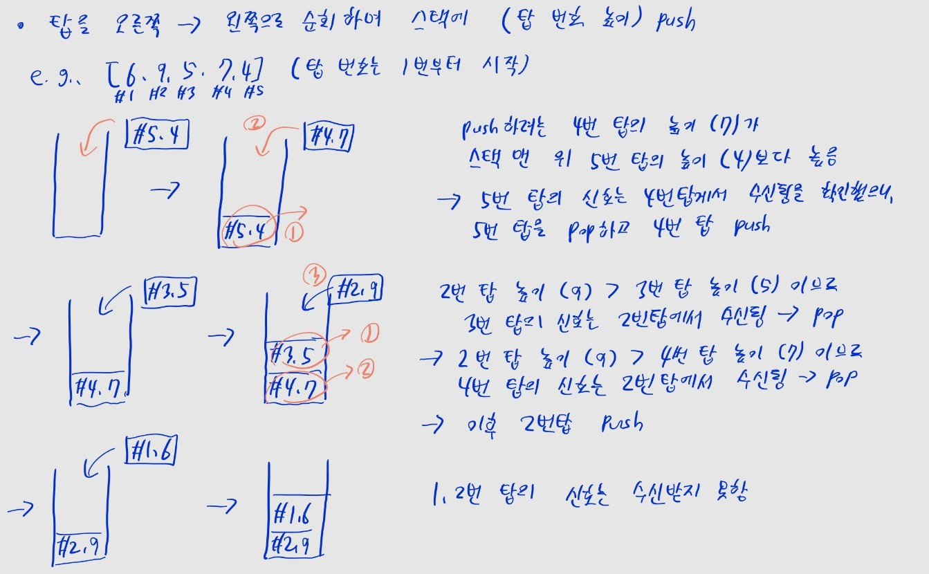 • 각 탑의 신호는 자신보다 왼쪽에 있는, 제일 가까운 높은 탑에서 받게 됩니다.