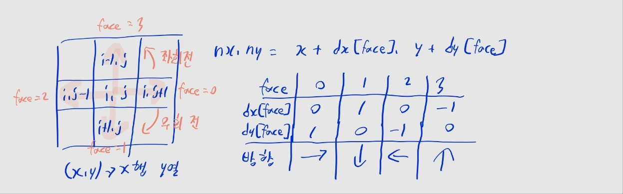 dx, dy 리스트는 뱀이 다음으로 이동할 칸을 계산하는 데 사용합니다.face에 따라 뱀이 쳐다보는 방향이 달라집니다.face가 1 증가(우 -> 하 -> 좌 -> 상)하고, 좌회전하면 1 감소(우 -> 상 -> 좌 -> 하)하도록 구현합니다.# 게임이 언제 끝나는지 반환