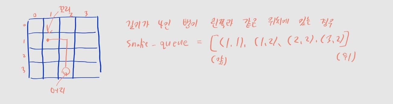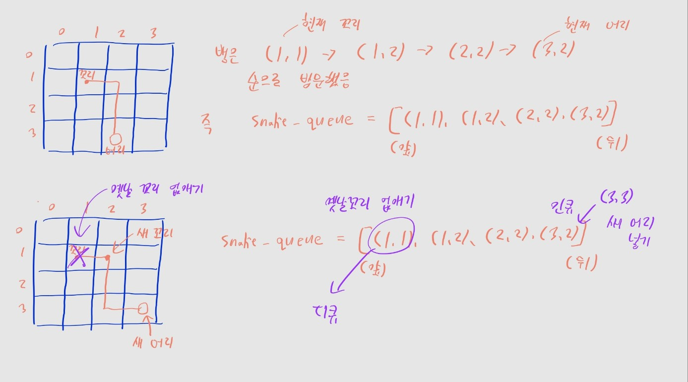set으로 관리하도록 하겠습니다.x행 y열에 도착했을 때, if (x, y) in apples을 이용해 사과의 존재 여부를 확인할 수 있습니다.(a - 1, b - 1)로 빼 줘야 합니다.comm_queue[0]을 이용해 방향을 바꿀 시간을 확인하고, 아직 안 됐으면 놔두고, 바꿀 시간이 됐을 때만 꺼내면 됩니다.# 뱀 위치 이동