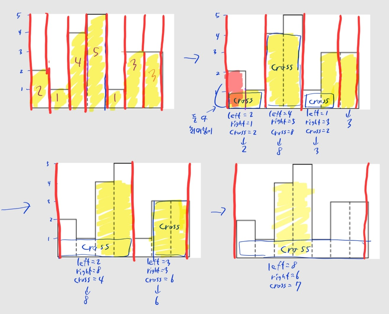 l번째부터 r번째 막대기까지의 넓이인 area로 (r - l + 1) * height를 구하고, 현재 cross보다 크면 갱신합니다.l을 l-1로 이동해서 왼쪽 칸을 탐색하거나, r을 r+1로 이동해서 오른쪽 칸을 탐색합니다.height (막대기들 중 최소 높이)가 더 높게 유지되는 쪽으로 이동합니다.r을, 더 오른쪽으로 못 가면 무조건 l을 이동합니다.while True)left, right, cross 중 최댓값을 반환하면 됩니다.