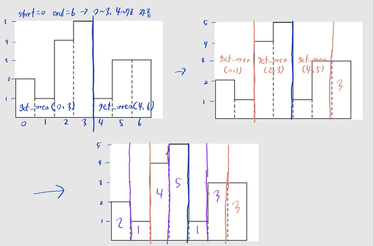 start ~ mid번째 막대기, mid + 1 ~ end번째 막대기로 영역을 나누었을 때l번째, 마지막 막대기를 r번째로 둘 때, 가운데부터 탐색하기 위해 l = mid, r = mid + 1로 둡니다.(밑변) * (막대기 높이 중 최솟값)이므로, 높이를 뜻하는 height 변수에는 앞으로 현재 탐색한 막대기들 중 최소 높이를 저장하겠습니다.l, r 두 막대기만 확인했으니, hist[l]와 hist[r] 중 최솟값으로 초기화합니다.cross 변수에 저장하고, 계속 갱신하겠습니다. 초깃값은 0으로 둡니다.# get_area 함수 계속