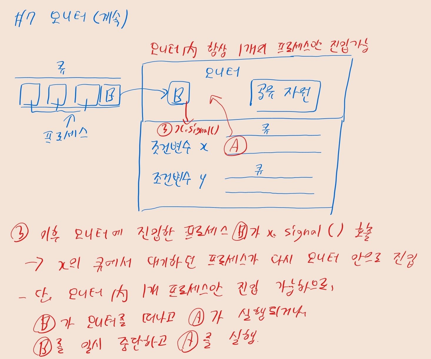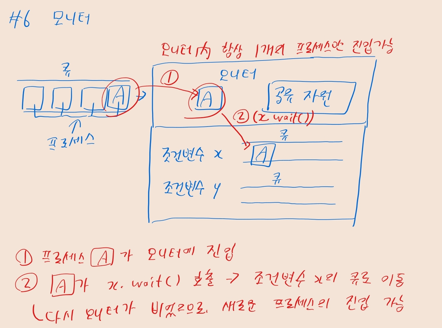 wait 연산: 호출한 작업 단위를 대기 상태로 전환 후, 조건 변수의 대기 큐에 삽입signal 연산: wait를 이용해 조건 변수의 대기 큐에 삽입된 프로세스의 실행을 재개