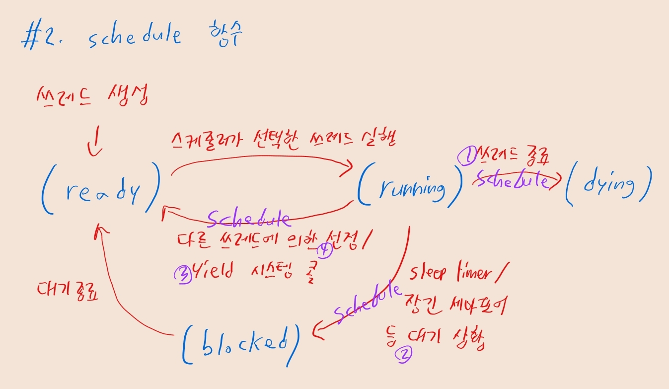 all_list 맨 끝에 삽입됨ready_list에 삽입됨ready_list는 우선순위의 역순으로 정렬됨 -> 올바른 위치를 찾아 삽입됨schedule, do_schedule: 쓰레드 스케줄링static void schedule (void){