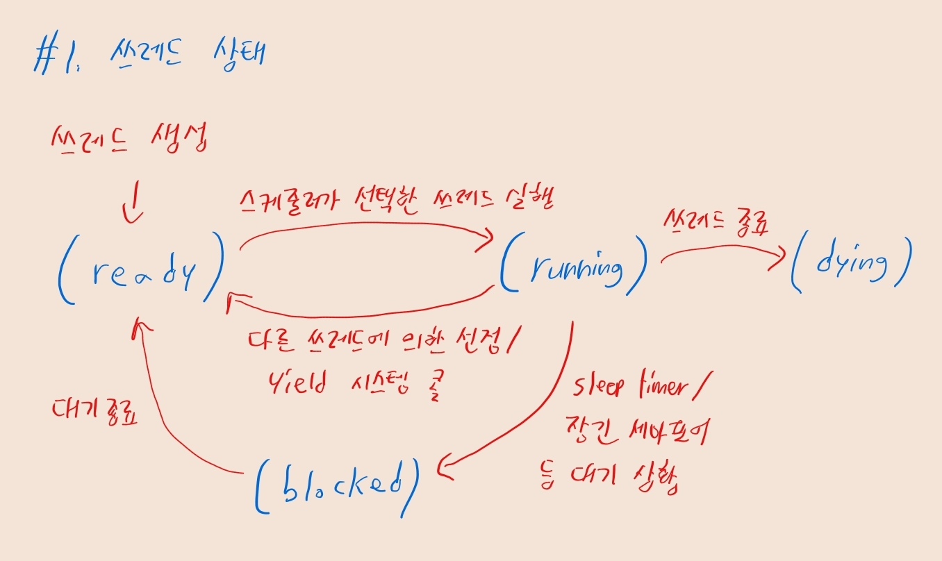dsc_sema_priority 함수를 만들어, semaphore_elem 기준으로 주소를 찾음thread 멤버로 원래 struct thread에 접근하고 priority를 비교struct thread: 쓰레드 관리 구조체struct thread 구조체로 관리됨enum thread_status status 멤버는 쓰레드의 현재 상태를 나타냄THREAD_RUNNING: cpu에서 실행 중.THREAD_READY: ready queue에서 실행할 준비가 된 상태. 현재 실행 중이진 않지만 BLOCKED 상태도 아닌 쓰레드.THREAD_BLOCKED: 특정 이벤트를 기다리는 쓰레드. sleep timer 종료라든가, 세마포어/뮤텍스 해제라든가.THREAD_DYING: 삭제 예정인 쓰레드. 실행 중인 쓰레드를 바로 삭제할 순 없으므로, 일단 이 상태로 표시해 두었다가 이후 스케줄러가 해당 쓰레드를 정리.