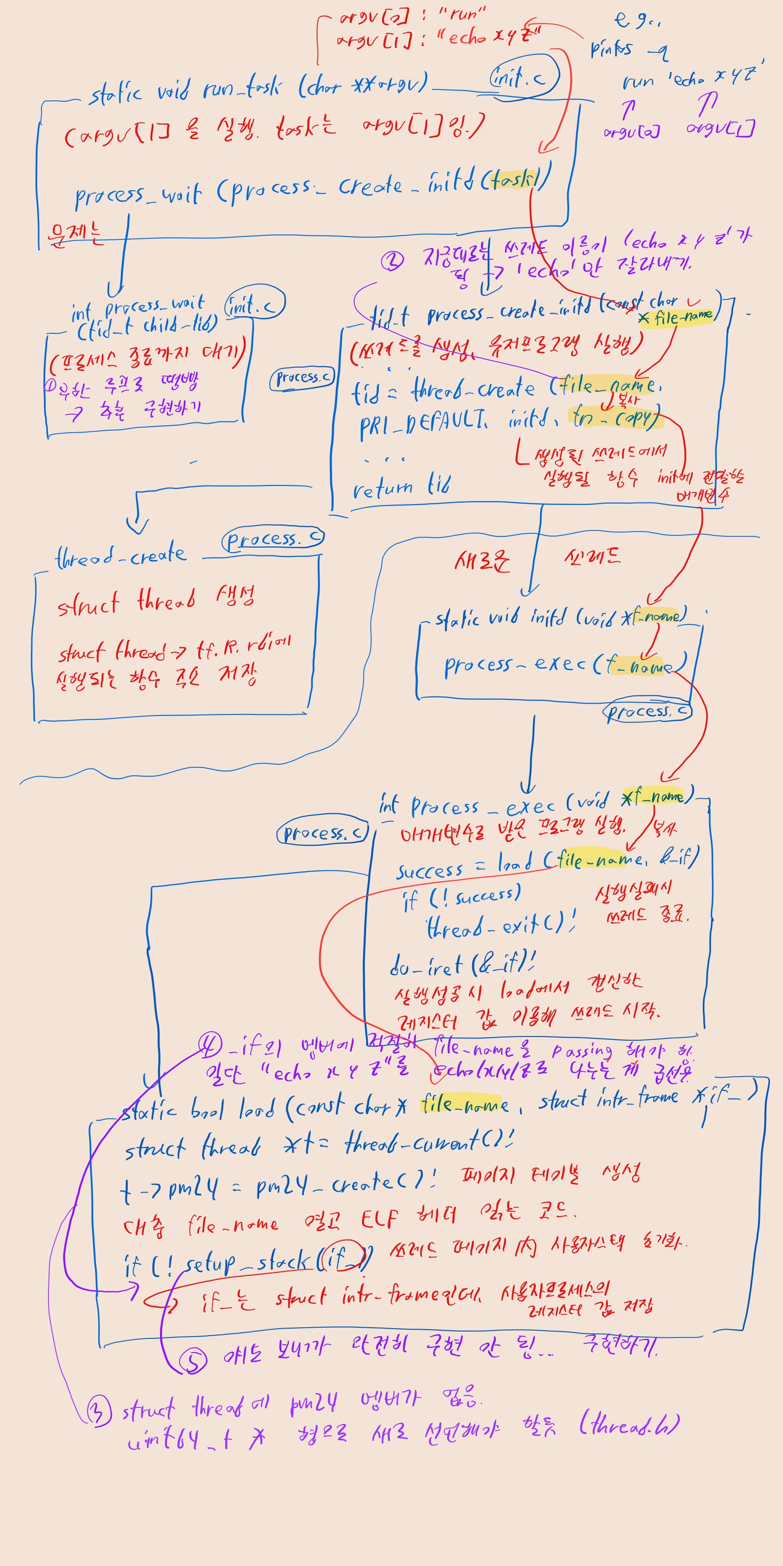 process_wait 함수가 정상 실행되지 않음process_create_initd에서 쓰레드 만들 때, 쓰레드 이름 수정해야 함thread_create의 file_name 매개변수로는 echo x y z가 전달됨echo x y z은 fn_copy에 백업한 뒤, thread_create의 쓰레드 이름으로는 echo만 전달해야 함.load에서 사용자 스택 초기화가 완료된 이후, argument passing하기'echo x y z'를 echo, x, y, z로 알아서 잘 나눈 뒤, _if (struct intr_frame 구조체: 대충 쓰레드의 레지스터 정보 저장됨)_if->rsp ) 에 전달해야 함do_iret이 _if를 참고해서, 레지스터 정보를 복원한 뒤 사용자 프로그램의 main()로 이동하게 됨.목표: 내일은 매개변수 전달 과정에 대해 조금 더 이해해 보는 걸로