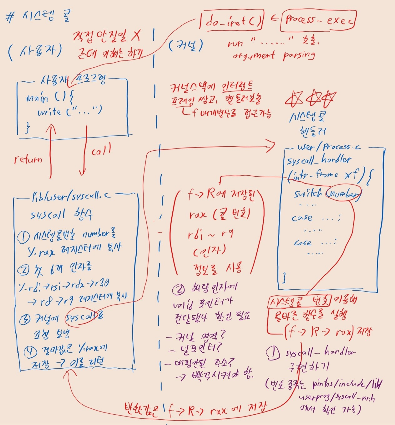 userprog/syscall.c 내 syscall_handler 함수 구현rax 레지스터에 저장됨 -> f -> R -> rax로 확인include/lib/syscall_nr.h에서 확인 가능 (열거형인데 0, 1, 2 순)f -> R의 rdi, rsi, rdx, r10, r8, r9 멤버로 확인 가능rax 레지스터에 저장해야 함// userprog/syscall.c
