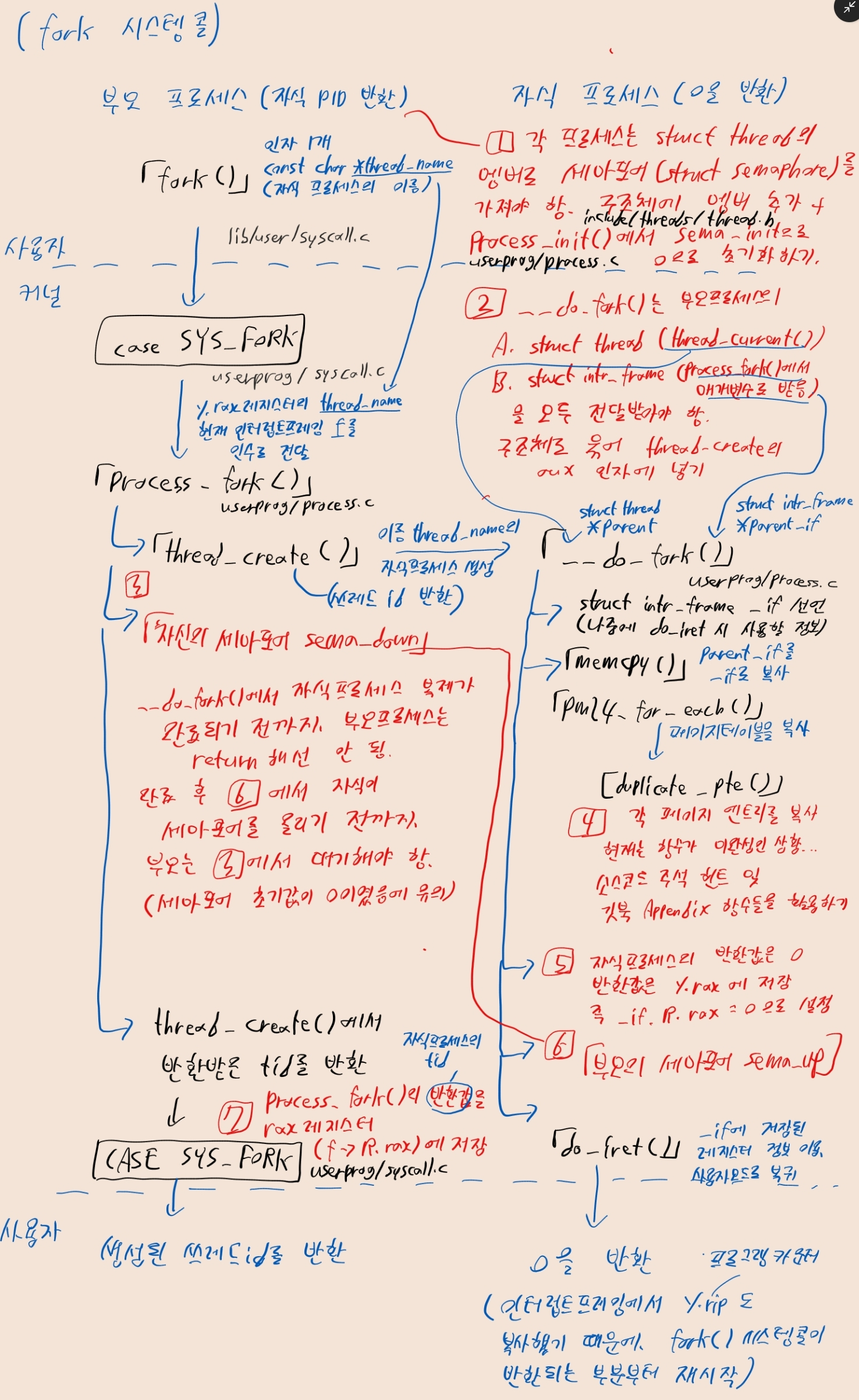 userprog/process.c의 process_fork 함수에서 프로세스 포크를 수행한다.userprog/syscall.c의 voic syscall_handler 내 case SYS_FORK 부분을 수정하면 된다.struct thread에 세마포어 추가하기include/threads/thread.h: struct thread에 fork 시스템 콜에 사용될 세마포어인 struct sempahore f_sema를 추가한다.#include "threads/synch.h" // 헤더 인클루드 잊지 말기