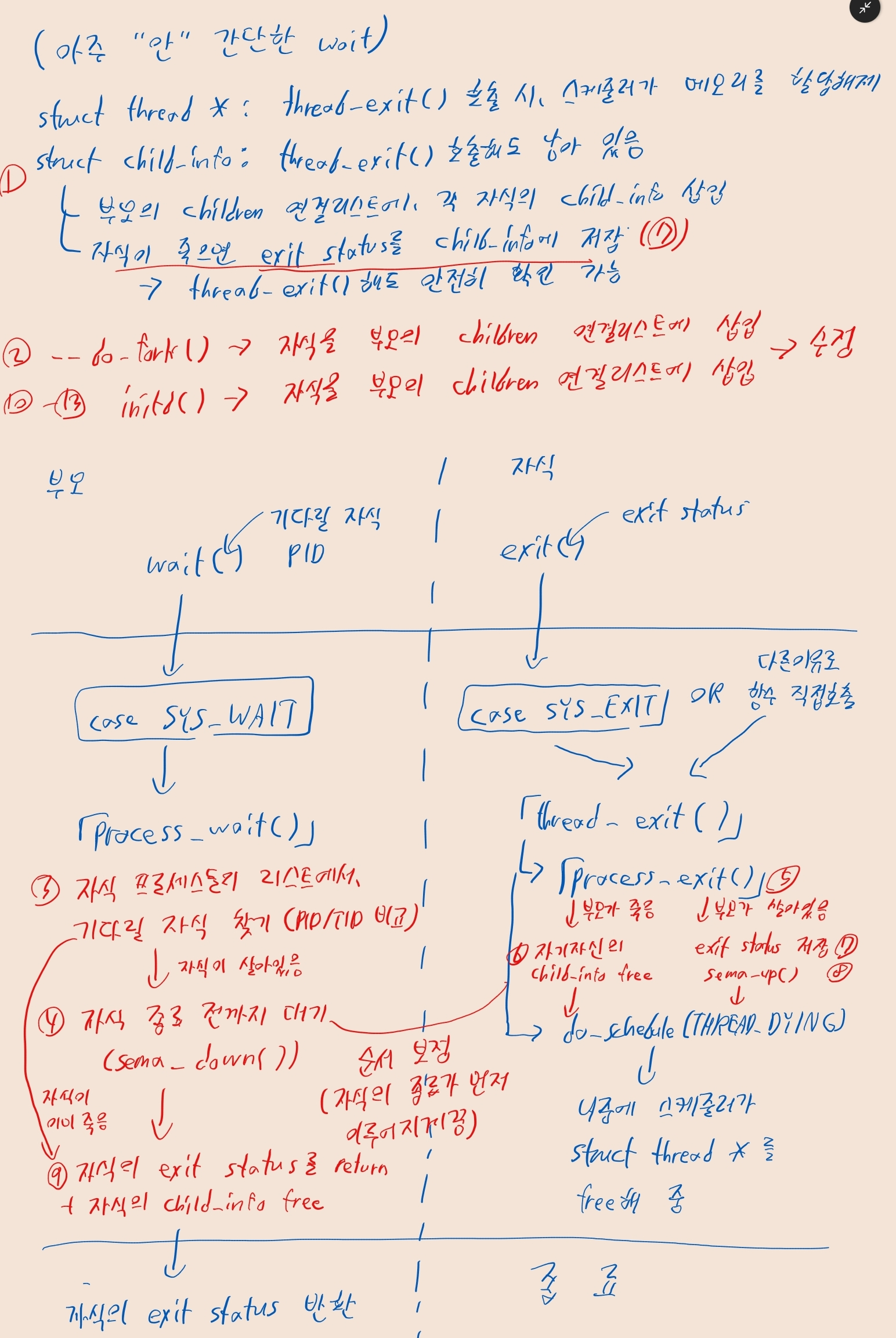 struct thread는 thread_exit() 하면 스케줄러가 나중에 메모리 할당을 free하게끔 구현되어 있습니다. (threads/thread.c의 do_schedule 함수의 palloc_free_page 참고하기)struct child_info를 만들어 줍니다. 대신 할당 해제는 저희가 알아서 해 줘야 하는데, 그것도 이따가 구현해야 함 ^^wait() 보내고 자식이 종료된 걸 확인하면, 그때 free해 줍니다.exit()할 때 스스로 free해 줘야 합니다. (그래서 parent_alive 멤버가 있는겁니다...)fork() 시스템 콜에서 자식이 생성될 때마다, 부모의 struct list children에 생성된 자식을 삽입해야 함__do_fork()을 수정하기// userprog/process.c 내 __do_fork() 함수 수정