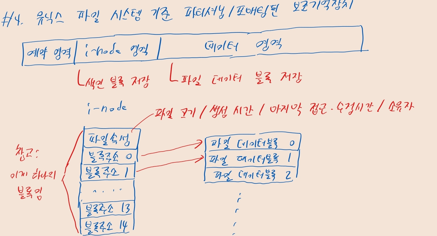 - 유닉스 파일 시스템 기준, 보조기억장치의 파티션은 예약 영역 / i-node 영역 / 데이터 영역 순