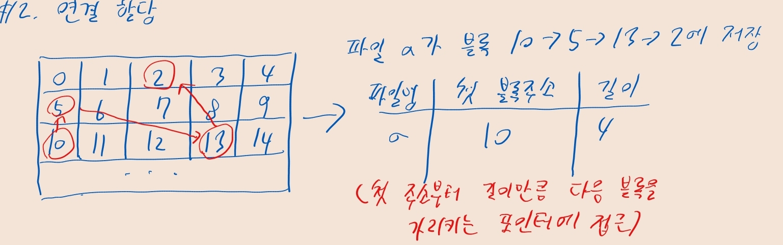 - 연결 리스트와 같이, 각 블록에 다음 블록의 주소를 저장해 다음 블록을 가리키게 함