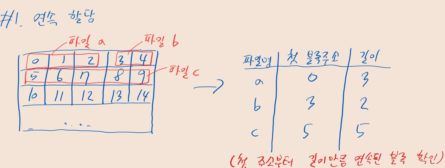 - 보조기억장치 내 연속적인 블록에 파일을 할당