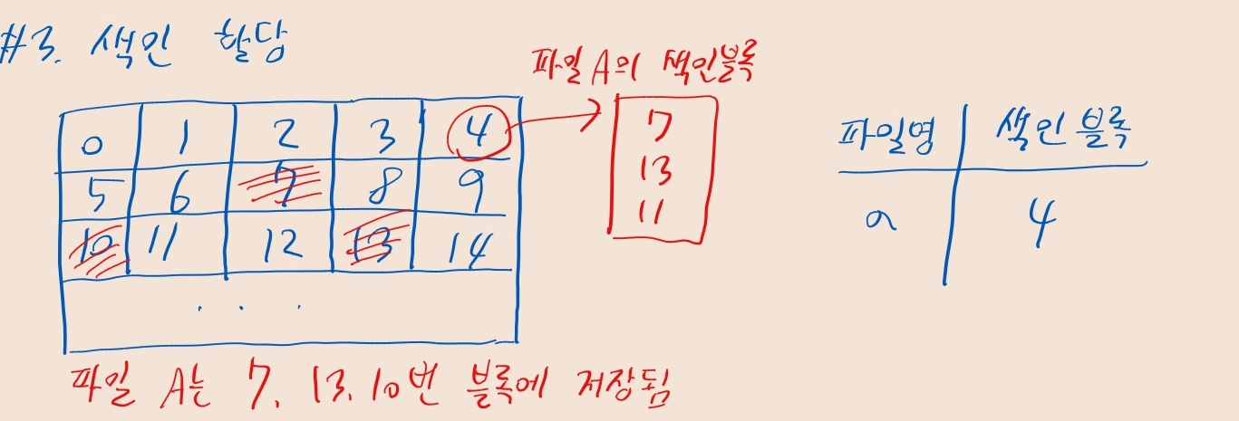 - 파일별로 색인 블록을 두어, 파일의 모든 블록 주소를 저장