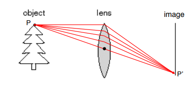 점 P에서 방출된 모든 빛이 렌즈를 통해 굴절되어 P'에서 융합된다.