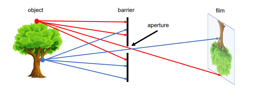 만약 barrier가 존재하지 않는다면, film위의 모든 지점은 3D Object의 모든 지점으로 부터 반사된 많은 빛들에 의해 영향을 받아 제대로 된 상이 맺히지 않는다.