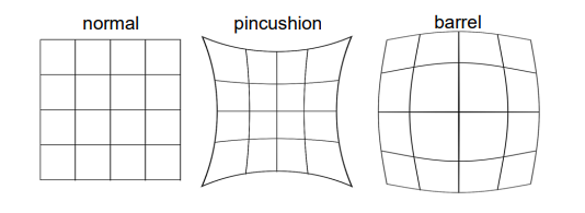 방사 왜곡(Radial Distortion)이란 렌즈의 결함이나 물리적 특성으로 인해 이미지의 배율이 광학축 중심에서의 거리에 따라 달라지는 현상이며, 이미지에서 멀어질수록 배율이 감소하는 Barrel Distortion과 멀어질수록 배율이 증가하는 Pincushion Distortion이 있다.