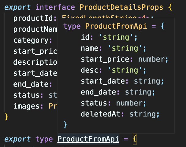 위와 같이 객체를 정의할때 type으로 정의하면 마우스 호버시에 키 값과 타입을 볼 수 있고 interface는 보이지 않는다.