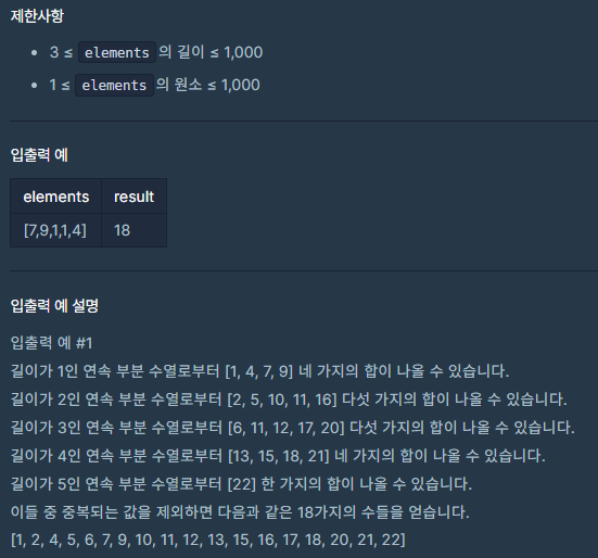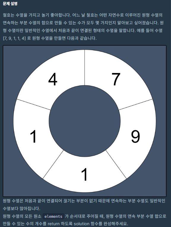- j부터 i번째까지의 합을 구하는 반복문(k % elements.length 이유 : 반복문의 중복을 피하고, 배열의 경계를 넘어서는 순환 부분 배열도 고려할 수 있음)