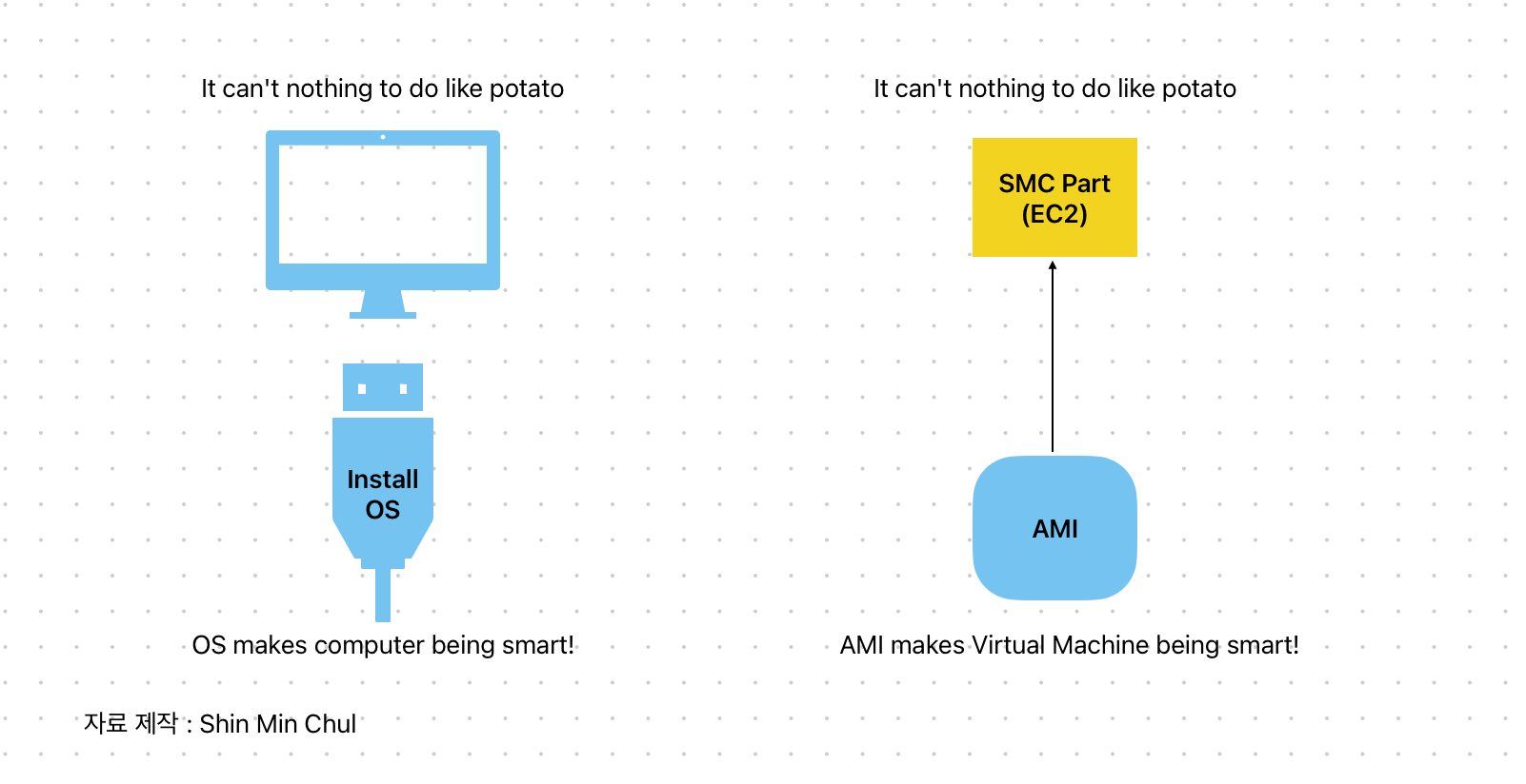 우리가 새 컴퓨터에 윈도우를 설치할때 손쉽게 CD 나 USB를 이용해 설치할 수 있는데, AWS 에서도 마찬가지로 새로 만들어진 가상머신 컴퓨터(EC2) 에 대한 손쉬운 환경 세팅을 위한 템플릿을 제공하는데, 이것이 AMI 서비스 이다.