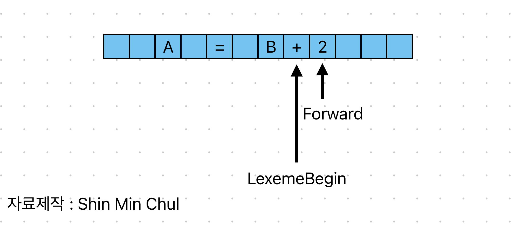 그리하여 어휘분석기는 모든 원시 프로그램의 문자들을 읽을 때, 어휘분석의 끝을 확신할 수 있는 근거로써 반드시 한개 이상의 문자를 더 추가적으로 미리 봐야 한다.