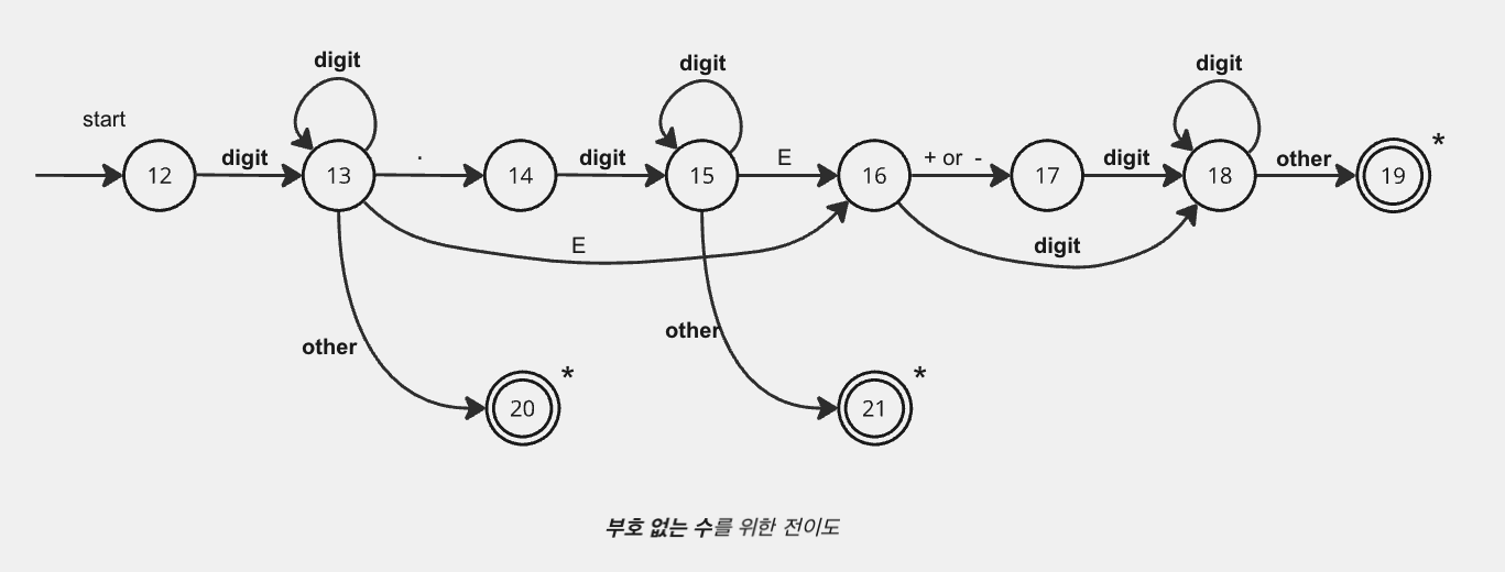 지금까지 보여진 전이도와는 다른 가장 복잡한 형태의 전이도이다. 해당 그림은 토큰 number를 위한 전이도이다. 상태 12에서 시작하여 숫자를 본다면 상태 13으로 간다. 상태 13에서 임의의 숫자를 반복적으로 읽을 수 있다. 그러나 숫자,소수점 또는 E이외의 다른 것을 본다면 정수 형태의 수를 읽은 것이다.