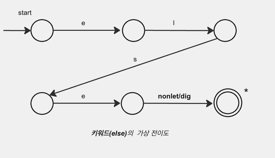 키워드 else 의 별도의 전이도를 이와 같은 그림으로 표현하였다. 이러한 전이도는 키워드의 각 연속된 문자를 본 후의 상황을 나타내는 상태. 비문자-또는-숫자(즉 식별자가 계속될 수 없는 문자)에 대한 테스트로 구성된다. 특히 식별자가 끝났다는 것을 검사하는 것이 필요하다. 그렇지 않으면 정확한 토큰이 반환되지 않을 수 있다.