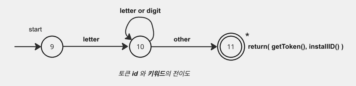 구체적인 동작 과정은, 상태 9 에서 시작하여 어휘항목이 문자로 시작하는가를 검사하고 그렇다면 상태 10으로 간다. 입력 문자가 문자나 숫자인 동안은 상태 10에 머문다. 문자나 숫자가 아닌 다른 것을 보았을 때, 상태 11로 가서 발견한 어휘항목을 수락한다. 마지막 문자가 식별자의 일부가 아니므로 입력을 한 위치 뒤로 옮겨야 하고 발견한 것을 심볼 테이블에 넣고 키워드인지 또는 식별자인지를 결정한다.