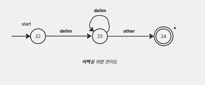 상태 24에서 연속적인 여백 문자가 찾아졌고 비여백문자가 따른다는 것에도 유의하여야 한다. 비여백 문자에서 시작하도록 입력을 뒤로 물리지만, 파서에 아무것도 반환하지 않는다. 오히려 여백문자를 발견한 후에 어휘 분석기를 재시작하여야 한다.